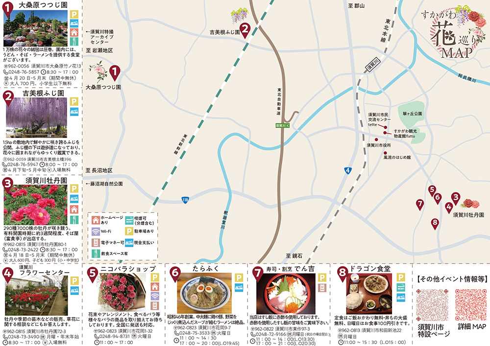 近隣のグルメや立ち寄りスポットも掲載されている春旅づくりにぴったりの「須賀川花巡りMAP」をぜひご活用ください。